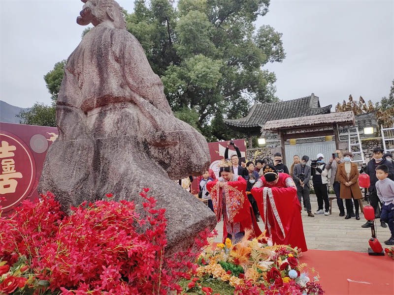 同牢合卺、解缨结发、行长辈礼、盟誓之约……乐清市淡溪镇梅溪村一对新人在梅溪草堂举办了一场文明简约的新中式婚礼。凤冠霞帔、峨冠博带,新郎新娘喜气洋洋面对南宋状元像行礼。别开生面的婚礼没有酒席,双方家长简单发言,整个仪式就结束了。这么一场简单的婚礼,却赢来了围观村民的齐声夸赞:“这样新办的中式婚礼意义非凡,婚事新办,既简单又省钱,对我们老百姓来说是大好事啊!”