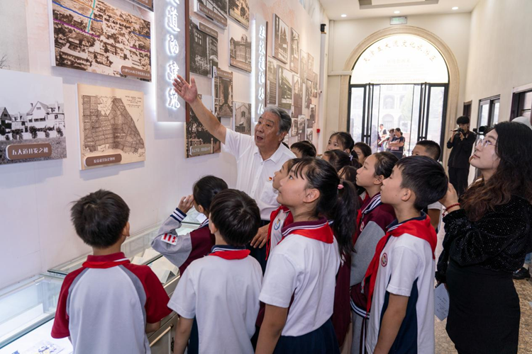 9月27日,天津市五大道文化旅游区志愿宣讲员张振东为新华南路小学学生讲解五大道的历史故事。新华网 钟奕 摄