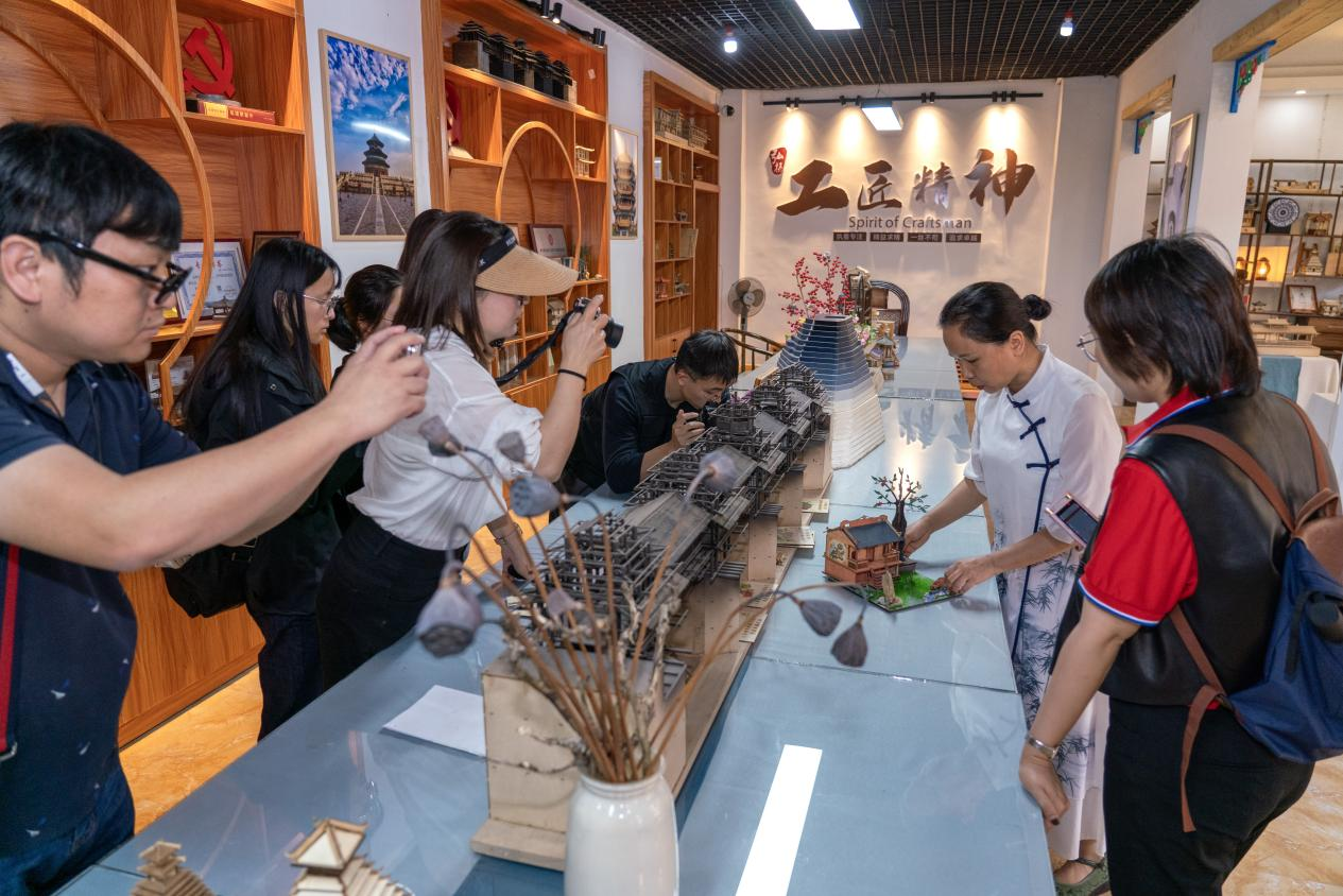 10月31日,在广西南宁市西乡塘区石埠街道忠良村“美丽南方—大墨榜样”非遗古建筑营造技艺传承基地,自治区非遗项目古建筑营造技艺代表性传承人周涛在介绍古建筑微缩模型制作技艺。新华网 钟奕 摄