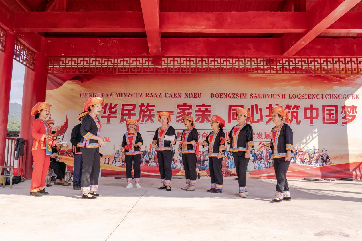 11月2日,广西梧州市蒙山县夏宜瑶族乡六海村的瑶族女青年正在排练山歌。新华网 钟奕 摄