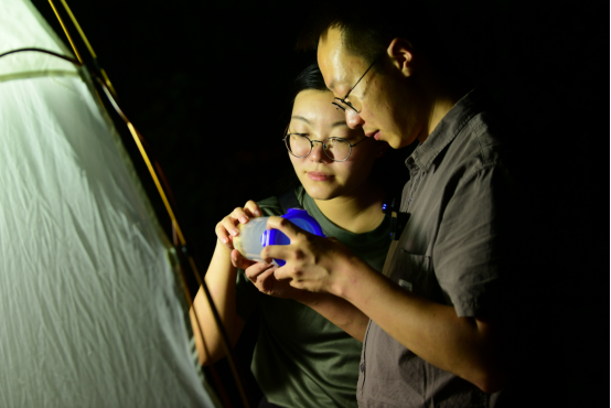 2024年9月9日,“中国好人”张超、张芯语夫妇正在观察刚刚采集到的蛾类。张超,重庆市江津区四面山森林资源服务中心野生动物疫源疫病监测站站长;张芯语,重庆市江津区林业局森林病虫防治站工作人员。新华网发(重庆市江津区融媒体中心 苏盛宇 摄)