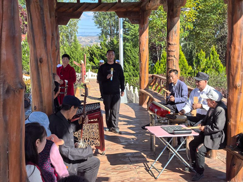 10月15日,张家川回族自治县马关镇新义村新时代文明实践广场,秦腔爱好者们正在练习秦腔唱腔。新华网 任钰 摄